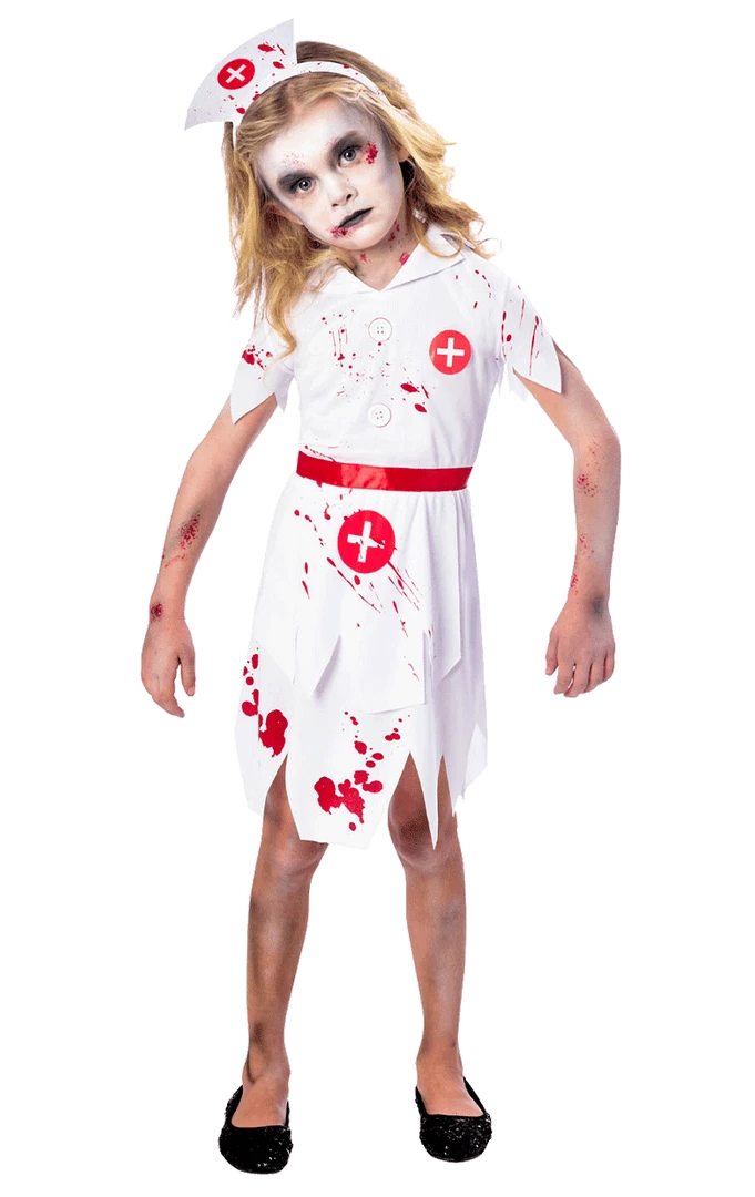 Ready to scare the town is this Girls Zombie Nurse Costume that’ll have the little one sticking out her arms while hobbling down the road.
