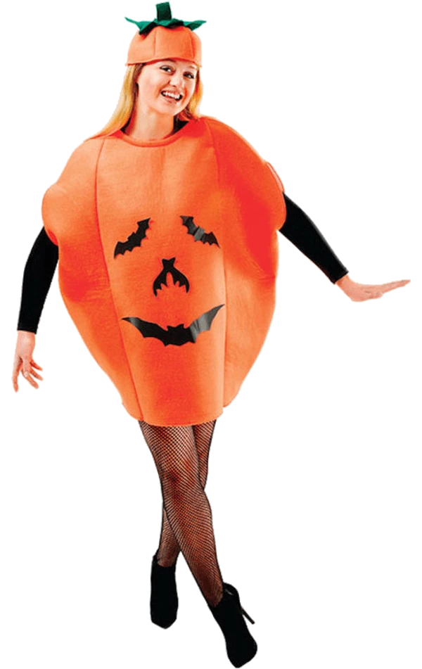 The Adult Pumpkin Costume includes a sleeveless orange pumpkin style bodysuit with a smiley face. The face is made up using black bats to create a spooky finish.