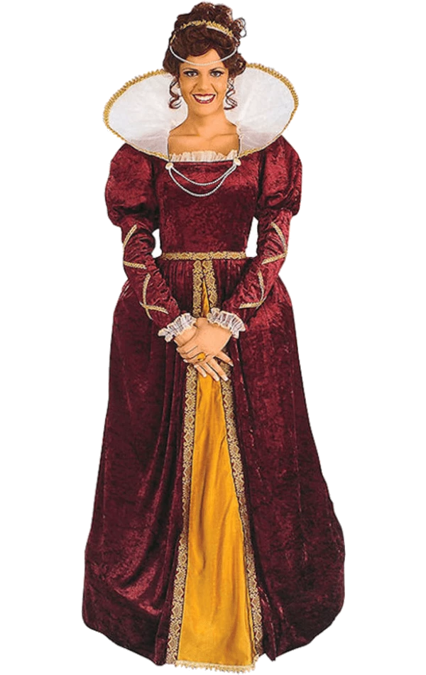 This deluxe Elizabethan style costume includes a long and regal burgundy and yellow dress with puffed shoulders. The fabric is made from polyester but looks and feels like real velvet. The dress comes with tapestry design trim, glitter french collar with gold trim and slim fitting sleeves with lace cuffs. The dress comes with a metal hoop at the base to create an elegant round look. Costume also includes a headpiece with faux pearls and golden trim.