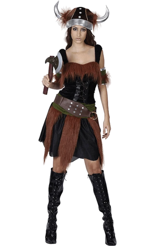 The Adult Viking Lady Costume includes a black and green dress with brown faux fur detailing and a brown studded belt with a gold buckle.
