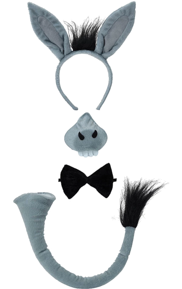 The Child Donkey Set includes a grey donkey headband with ears and a donkey nose. The nose produces realistic donkey sound effects.
