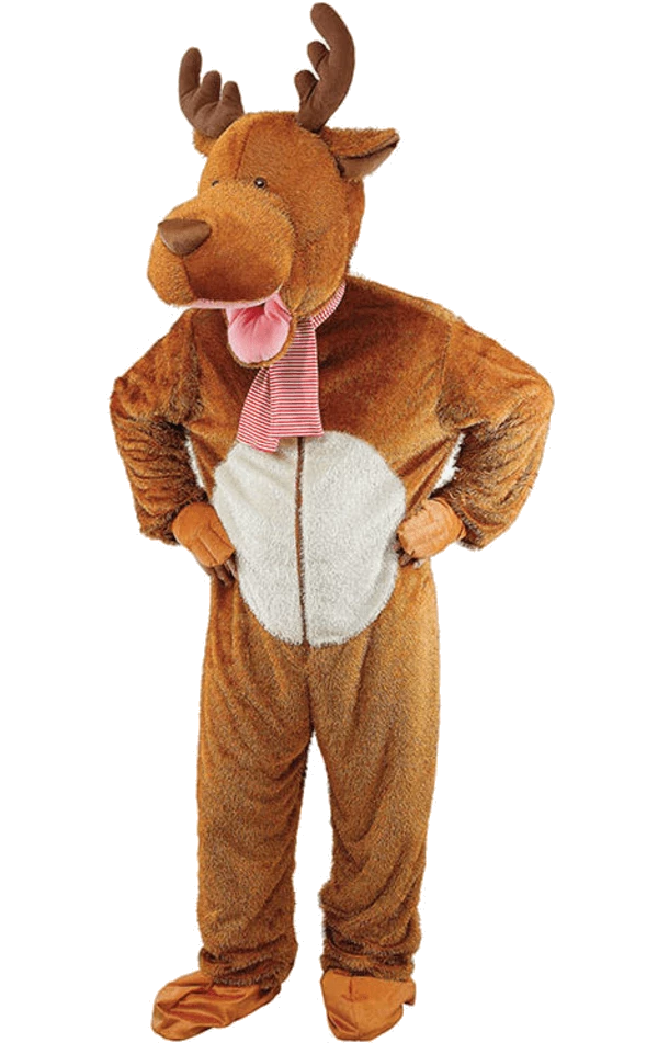 The Cuddly Reindeer Costume includes a brown zip-up jumpsuit with a lighter stomach section, a pair of attached boot covers and a matching pair of attached gloves.