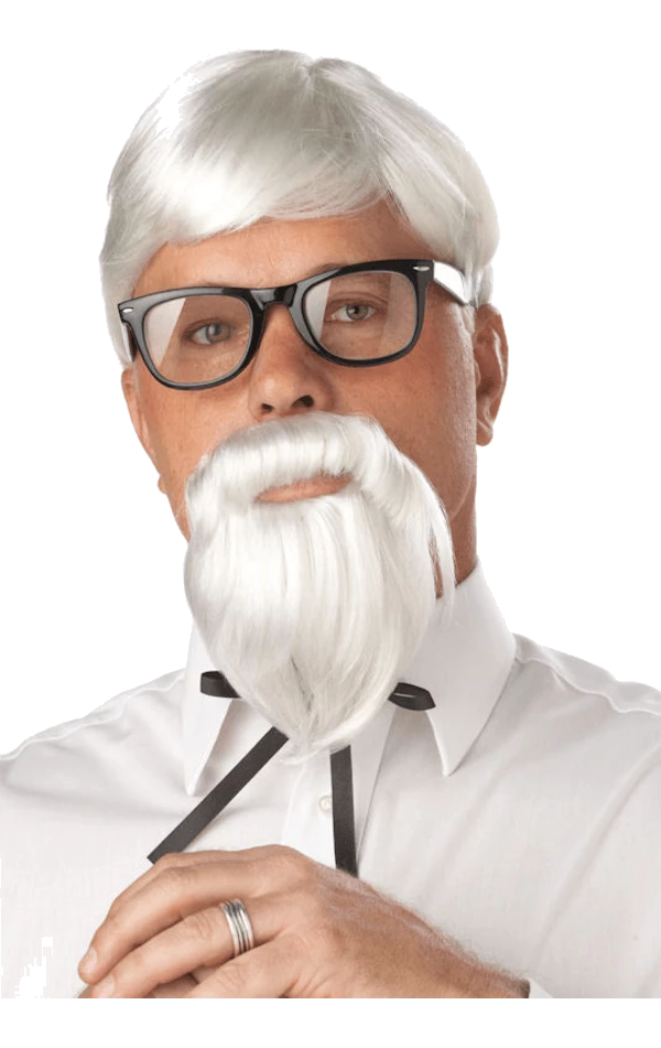 This Adult The Colonel Wig and Moustache kit includes a white wig and a long white beard with an attached moustache. Perfect for the Colonel Sanders KFC inspired look!