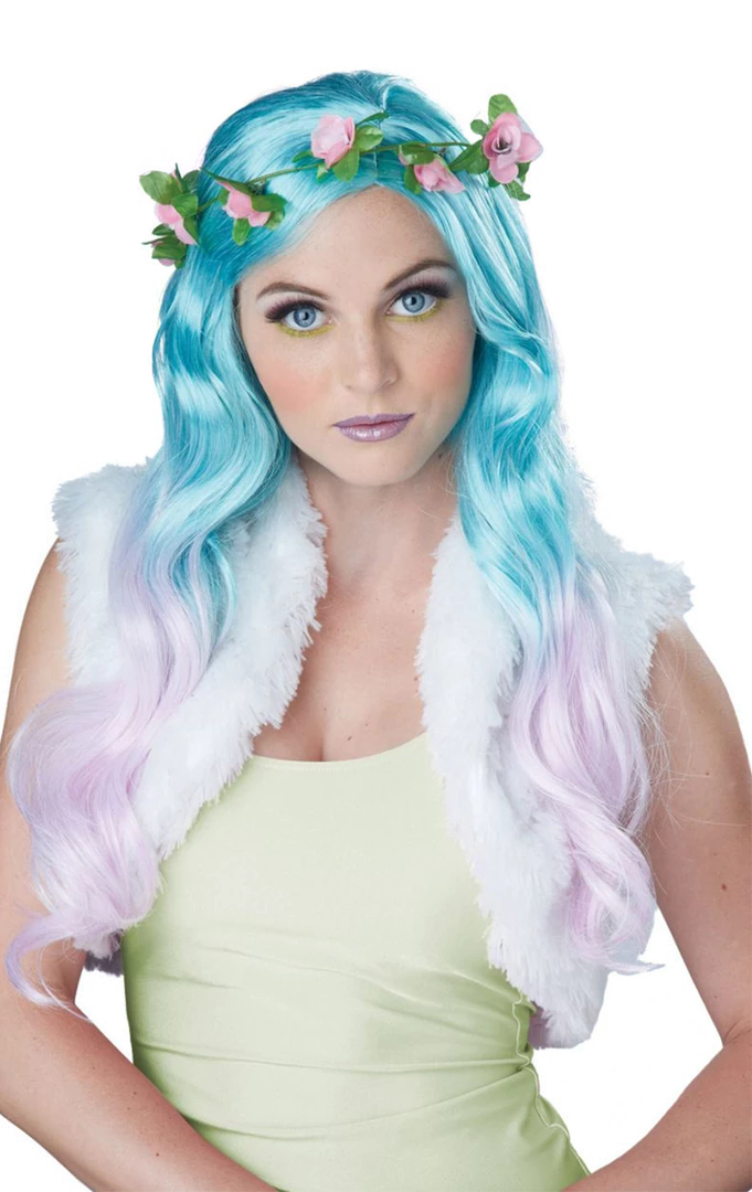 It’s a beautiful wavy ombre wig that goes from blue to a cotton candy pink and is adorned with a pretty flower wreath to look like the goddess of nature.