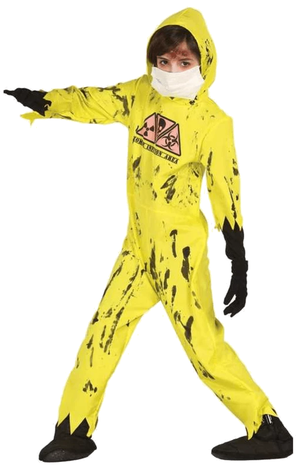 The costume includes a yellow ripped effect hooded jumpsuit with black splatters all over to replicate the look of radioactive waste. On the front features the symbols warning that there is radiation in the area.