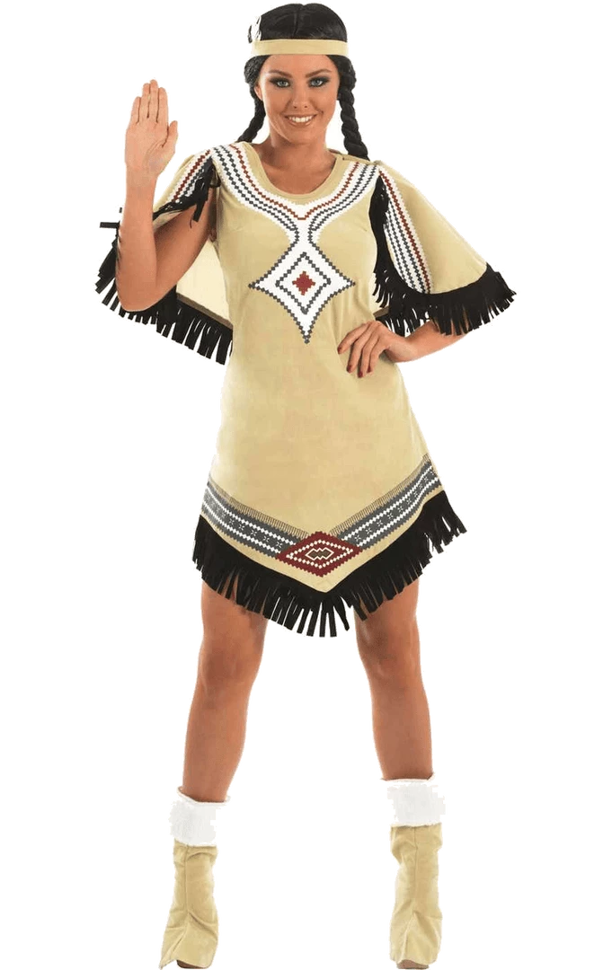 The Adult Womens Indian Scout Costume features a beautiful detailed dress printed with a series of Native American patterns. Along the hem and the open, cape like sleeves is black fringing.
