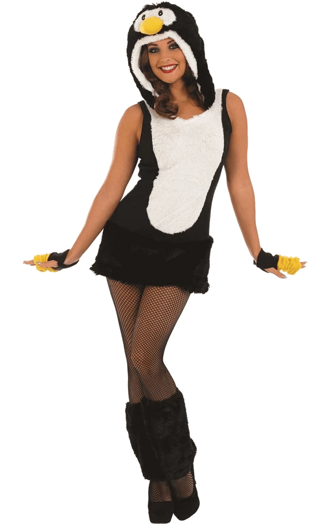 You’ll be kitted out in a soft-feel hooded black dress with fur trim and a white fur panel to the front. The furry hood features a cute penguin character face and to complete the costume is a pair of glovelettes and black boot covers.