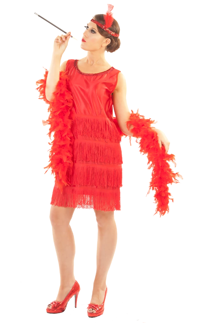 Glide into a roaring twenties party dressed like you’ve just came of the set of Great Gatsby, with our Roaring 20s Flapper Red Costume. It perfectly envisions the glitz and glam of the 1920’s and is made up of a red flowing tassel dress. A matching headband with a feather completes the look.