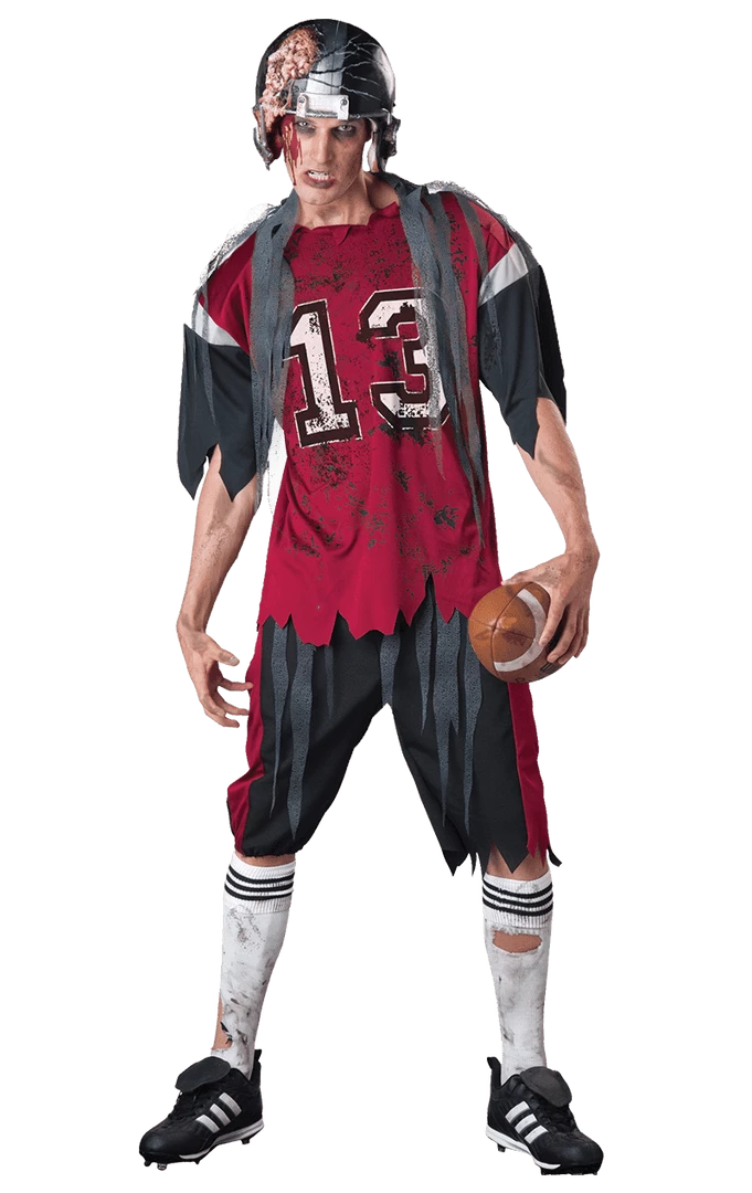 This unlucky number 13 Quarterback won’t let death stop him playing the game this Halloween. With his bashed football helmet with exposed brain and gory tattered clothing, this is a zombie sportsman not to be messed with! He’s part of a winning zombie team when coupled with our Spiritless Cheerleader.