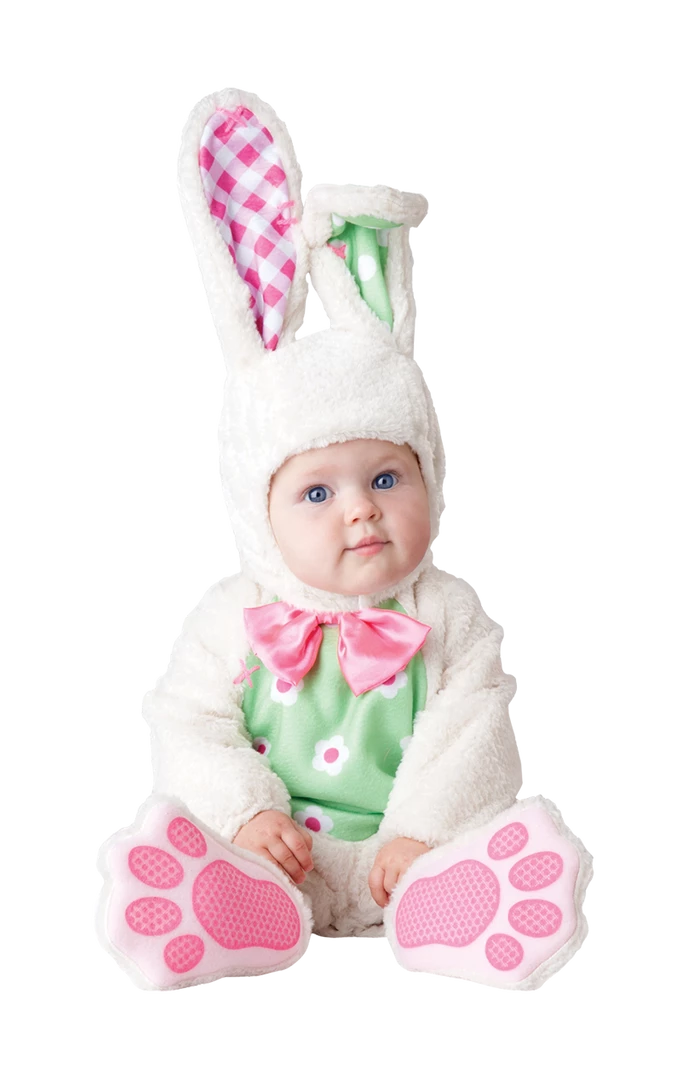 Our Baby Bunny Rabbit Outfit comes complete with a fluffy white jumpsuit that’ll keep your little bunny warm, especially during the cooler months. The costume also features a stunning green print on the front, complete with pink and white flowers and a little pink bow. To ensure your baby doesn’t fall over the place when they’re hopping around the house, the costume is fitted with non-slip feet. They can be just like Bugs Bunny without slipping all over the place. To finish off the look, the outfit also comes with a detachable hood that’s made of the same material as the jumpsuit. The hood is white, featuring two long bunny ears with pink and green detailing on the inside.