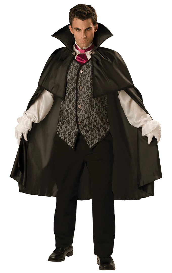 Dress to impress this Halloween in our deluxe Midnight Vampire costume. Dracula himself would be envious of this outfit, with its impressive swirling black cape and lace detailed waistcoat, ready to charm those innocent victims. Complete the look with some mouldable fiendish fangs.