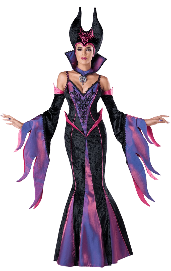 It comes with a matching royal collar and a dramatic devil-horn headpiece that resembles Maleficent’s.