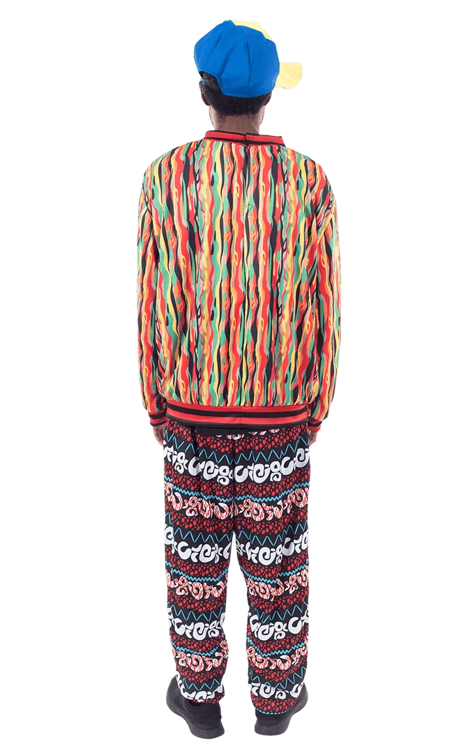 Our Adult 90s California Prince Costume comes complete with a vibrant long sleeve top, featuring a rainbow of colours all over, with red and black detailing around the collar, sleeves and the hem. Also included is a pair of equally as colourful trousers, with an array of unique prints. To complete this ultimate Prince of Bel Air look, a blue and white cap that’s also included. You’re all set for a game of basketball and getting up to no good in the neighbourhood!