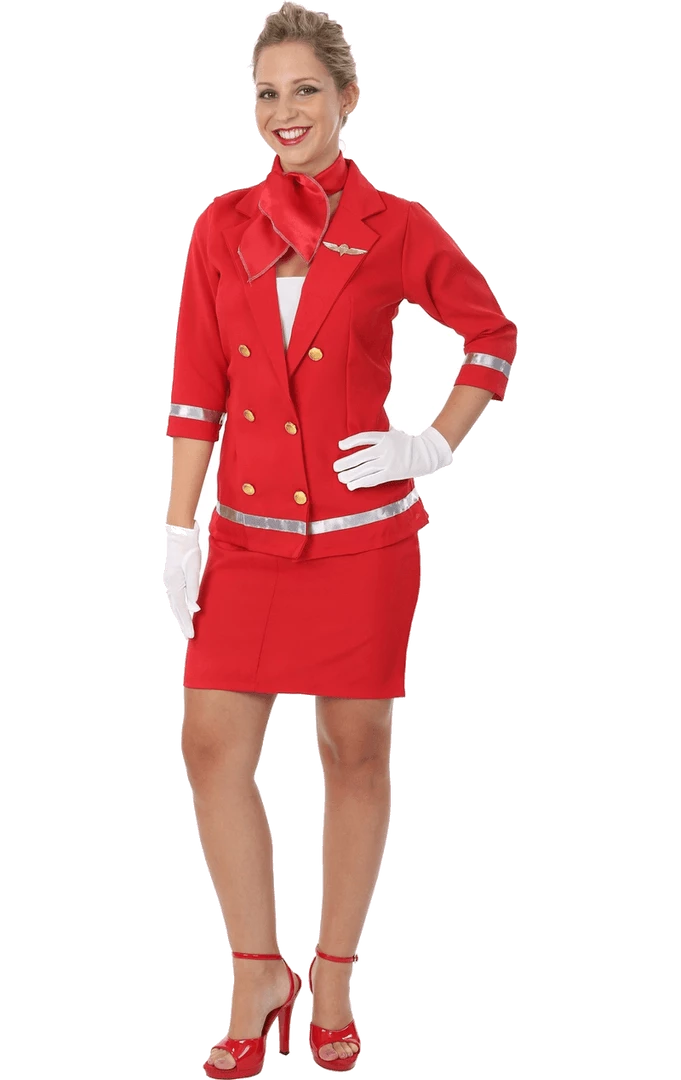 The Adult Sizzling Red Air Hostess Costume boasts a red uniform that’s fit for any high flyer. It consists of a red blazer jacket with gold button detailing and a white t-shirt front. The outfit also includes a matching red skirt that comes up just above the knee. To finish off your jet setter look, the costume features a matching red necktie.