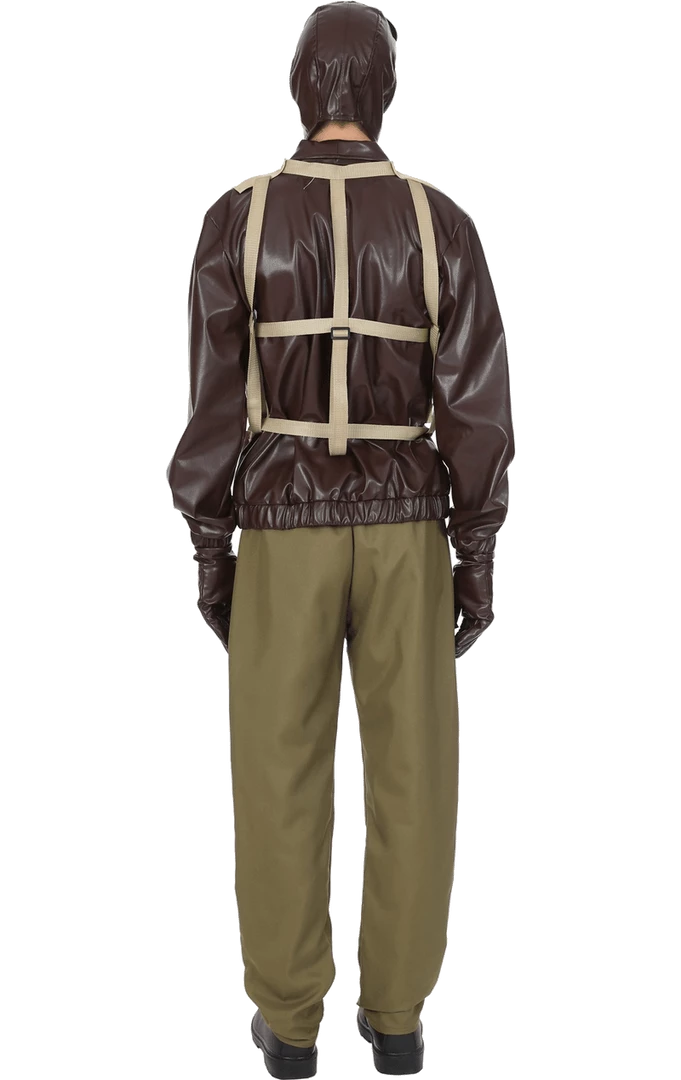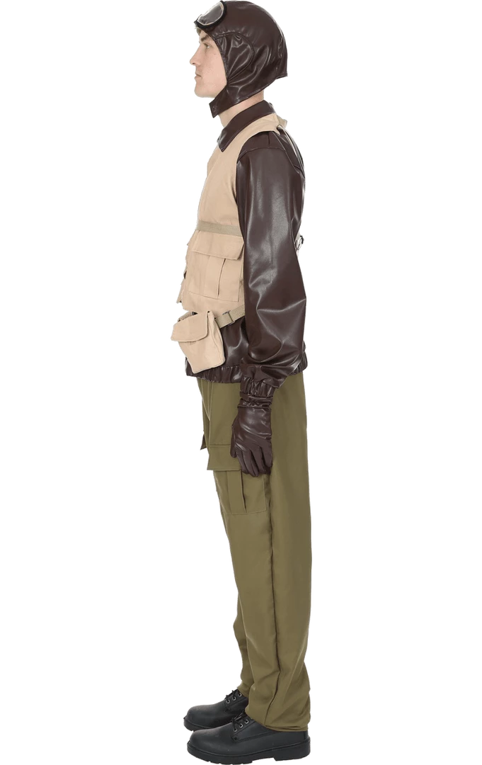The Adult Mens WW2 War Pilot Costume comes complete with a leather look jacket  that features a harness with adjustable straps around the middle. The costume also includes a pair of beige trousers, a pair of gloves and a headpiece with attached googles.