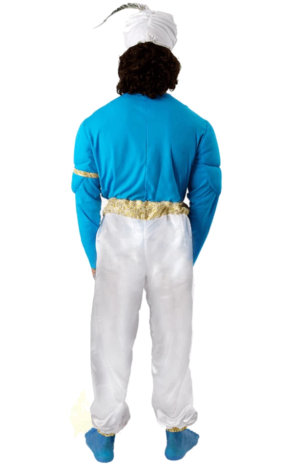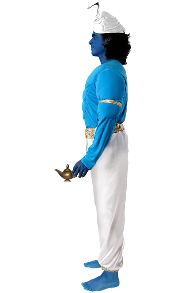 The Mens Aladdin Genie Costume is a full blue and white bodysuit. It has ornate gold detail and a valiant muscle chest to give you a fantastic muscular physique.