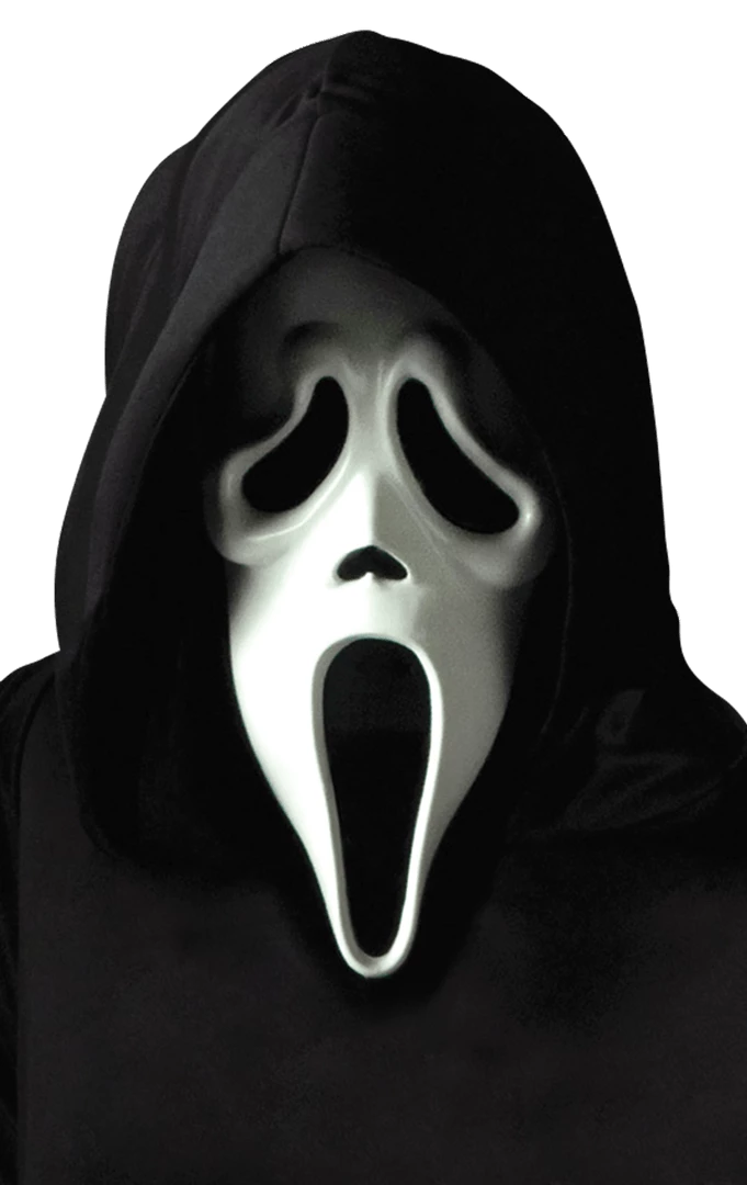 The Scream Facepiece comes as a black hood with cowl and white facepiece with holes for eyes and wide open mouth.
