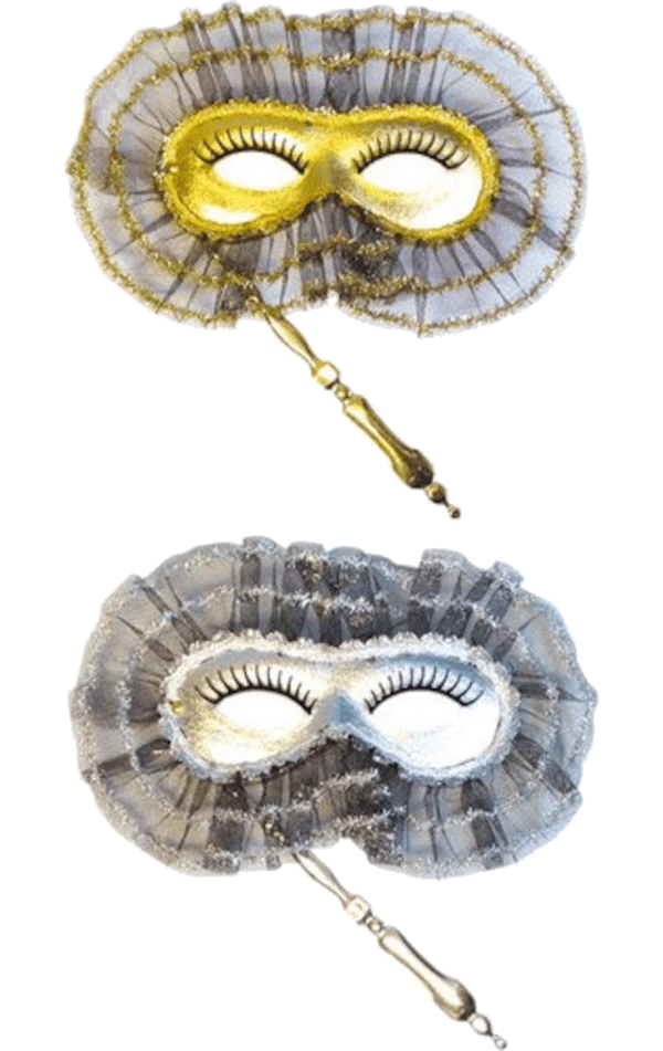 Eye facepiece in silver or gold with attached stick. Perfect for a masquerade ball or marquis costume.
