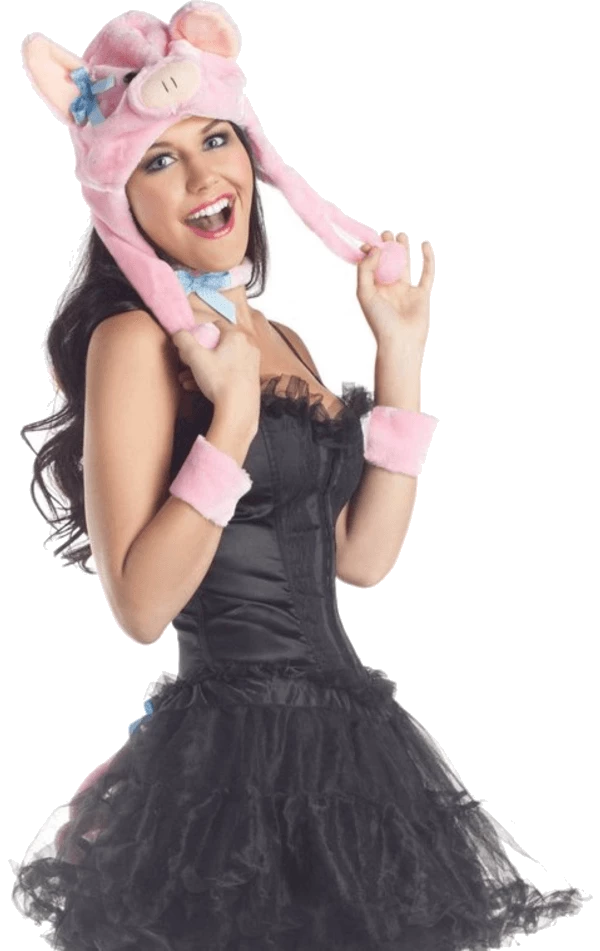The Piglet Costume Kit includes a pink piglet hat, with matching collar, wrist cuffs and a curly tail.