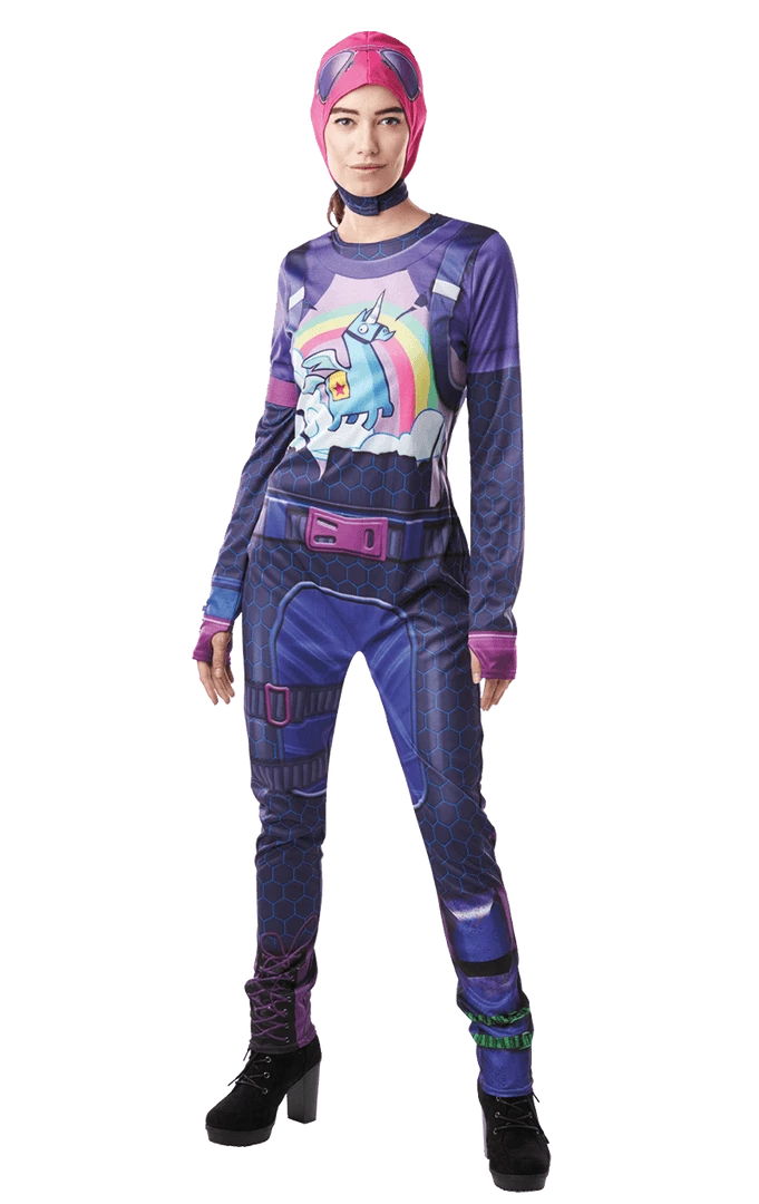 Girl power comes in all forms, in this instance, it’s our brilliant Adult Brite Bomber Fortnite Costume – Deluxe! She’s a pink, purple and rainbow coloured character from the global phenomenon that is Fortnite. Despite her lady-like style, when given the right equipment the Brite Bomber can dominate a game and take down the 99 enemies around her with ease. This deluxe outfit features: Full jumpsuit with armband, snood and chug jug drink holder.