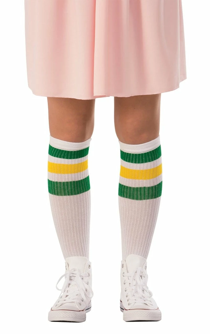 Inspired by the hit Netflix show Stranger Things, they’re white with yellow and green stripes and resemble the ‘80s fashion tube socks.