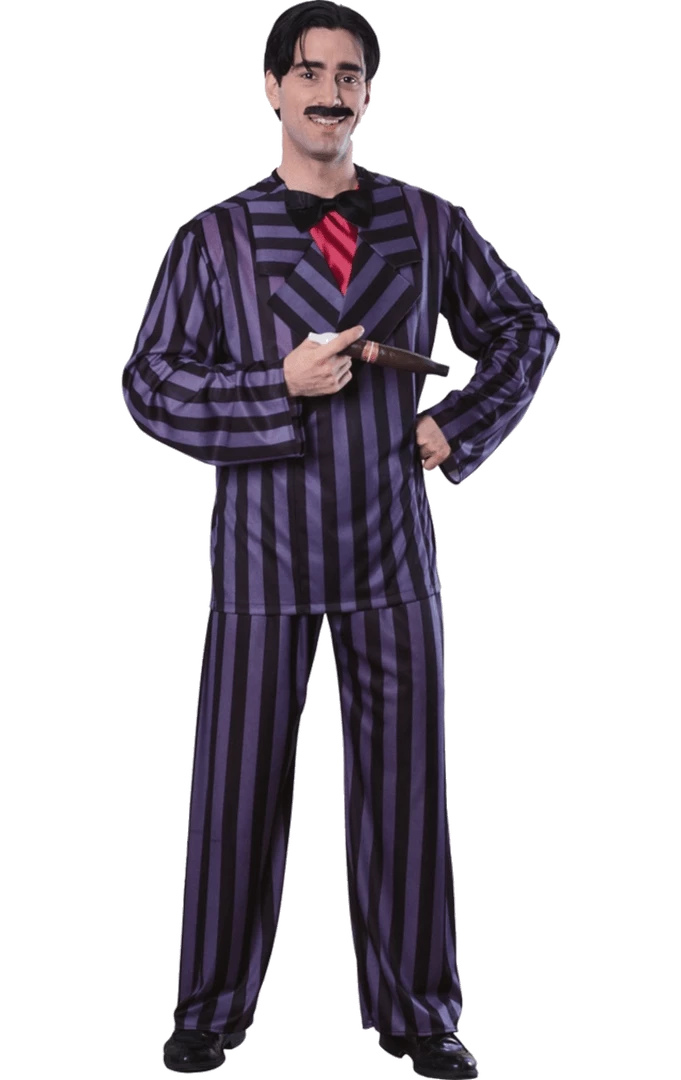 Adult Halloween or television themed The Addams Family costume includes thin jacket shirt with purple and black vertical stripe design and red inset under shirt with faux black bow tie.