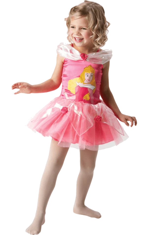 The Child Sleeping Beauty Ballerina Disney Costume includes a pink ballerina dress with pink floral motifs and Sleeping Beauty printed on the front.