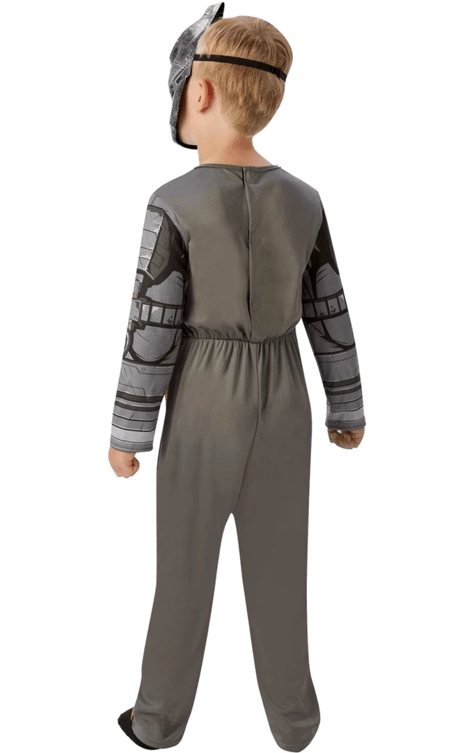 This officially licensed product features a jumpsuit printed with the caped crusaders grey armour including yellow utility belt and strap across the chest on the front of the body.