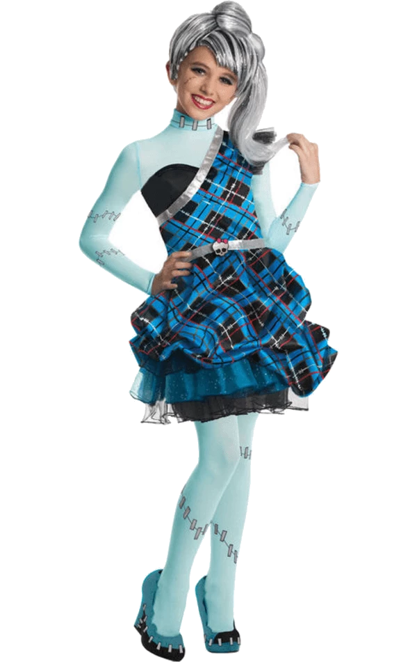 Our Child Monster High Frankie Stein Sweet 1600 Costume includes a tartan dress in blue, black and red with light blue arms that will transform any young girl into the Monster High character.
