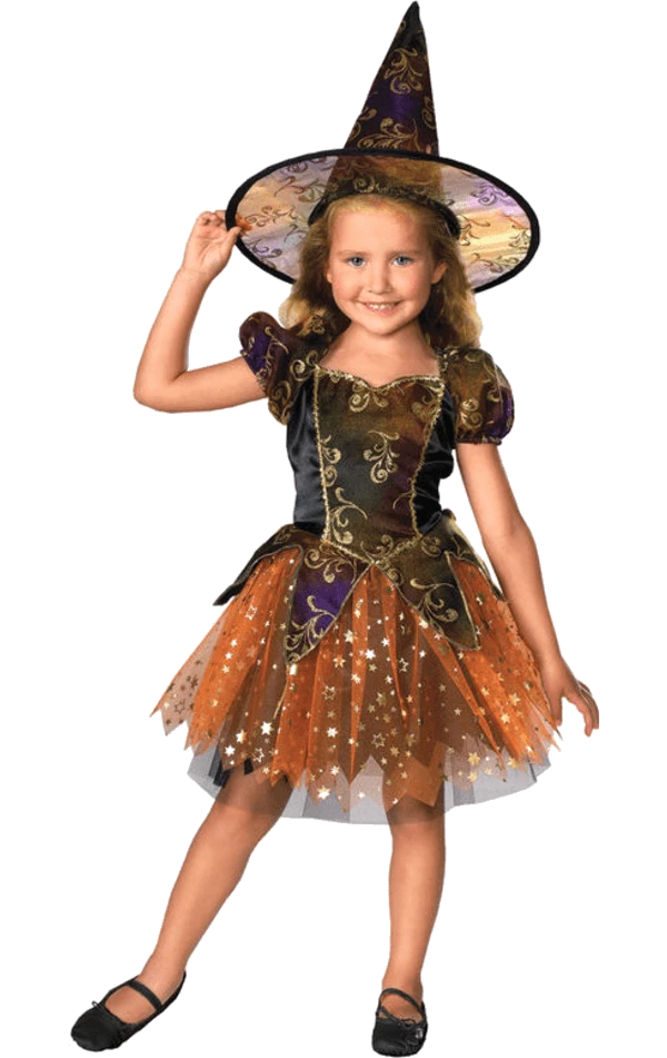 The Child Halloween Witch Costume includes a black, purple and orange dress decorated with gold swirls and gold stars on the skirt.