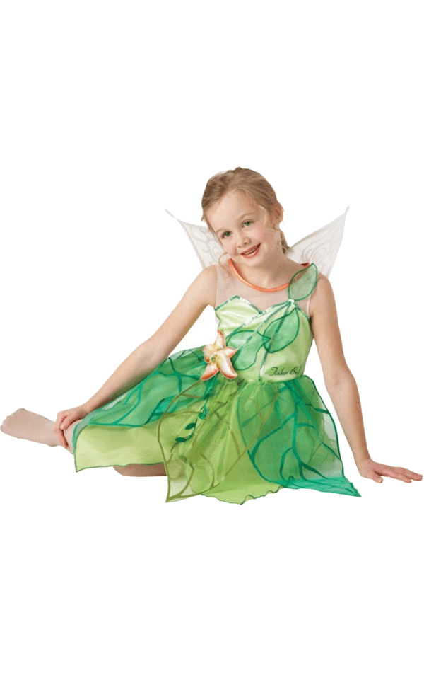 The Children’s Tinkerbell Costume includes a green dress with a leaf shaped overlay on the skirt and green sequin detailing. Also included is a pair of fairy wings.
