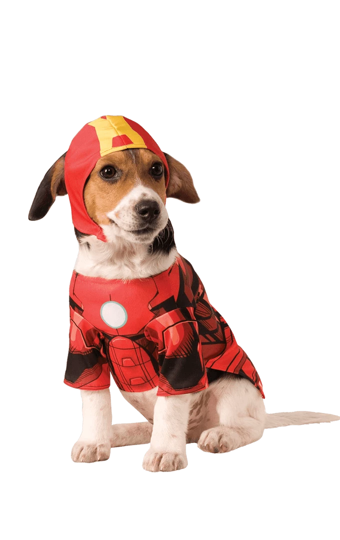 Dress your dog up like a billionaire playboy in this Iron Man Dog Costume, featuring an easy slip-on red bodysuit and hood.