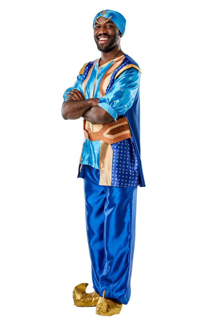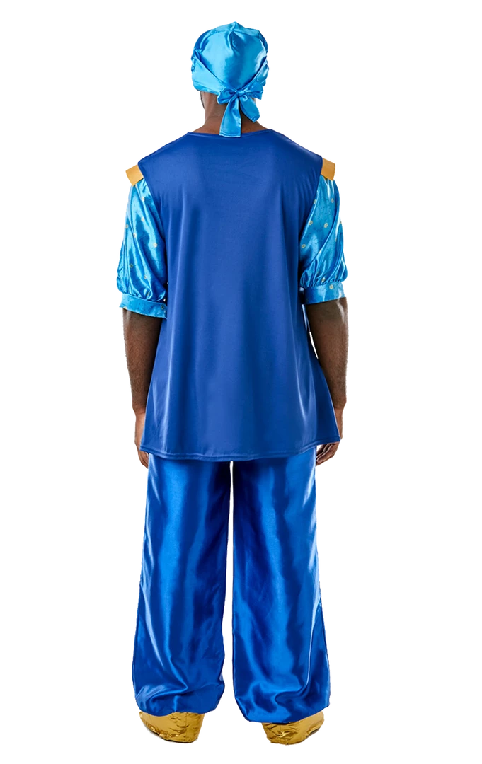 Dress up like the Genie himself in our Mens Aladdin Genie Costume. The costume features a blue short-sleeved top with various patterns and detailing on the front, a pair of emerald blue flared trousers and an Arabian-style blue hat with a gold chain.