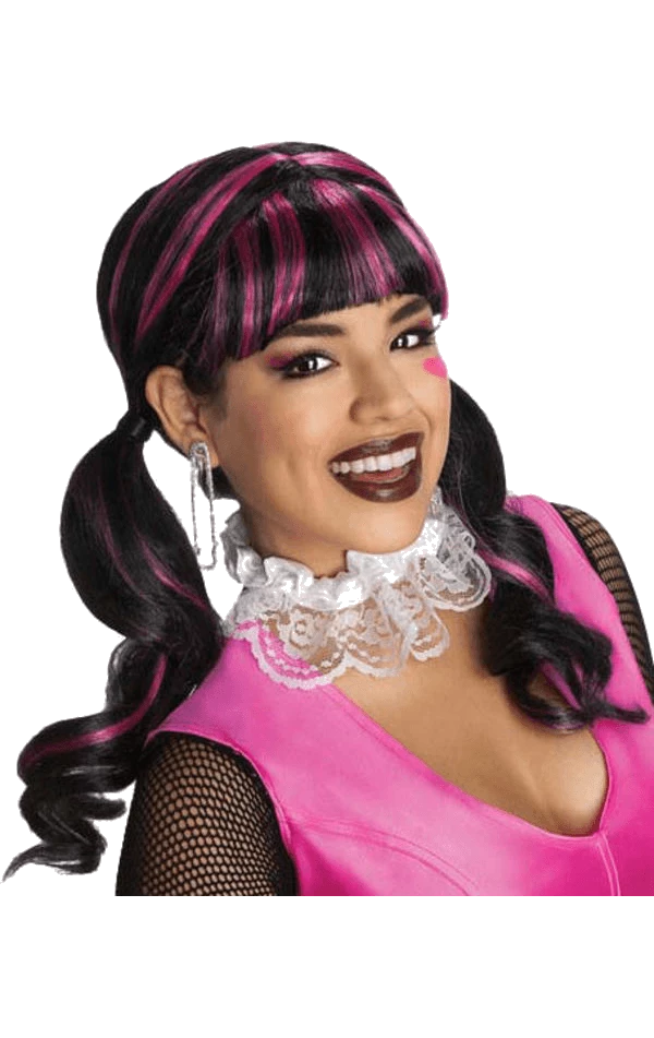 Our Monster High Draculaura Wig is black and pink and styled with pigtails.