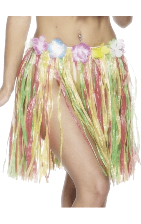 46cm long hula skirt, multicolour with flowers. Skirt has an elasticated waist with Velcro fastening and would comfortably fit a dress size 8 to 10.