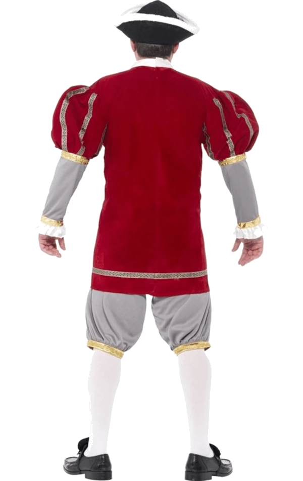 This historical inspired costume features a long sleeved top that fastens at the back using velcro. The top is adorned with a red jacket detail with a fake fur trim and puff sleeves with gold trim.