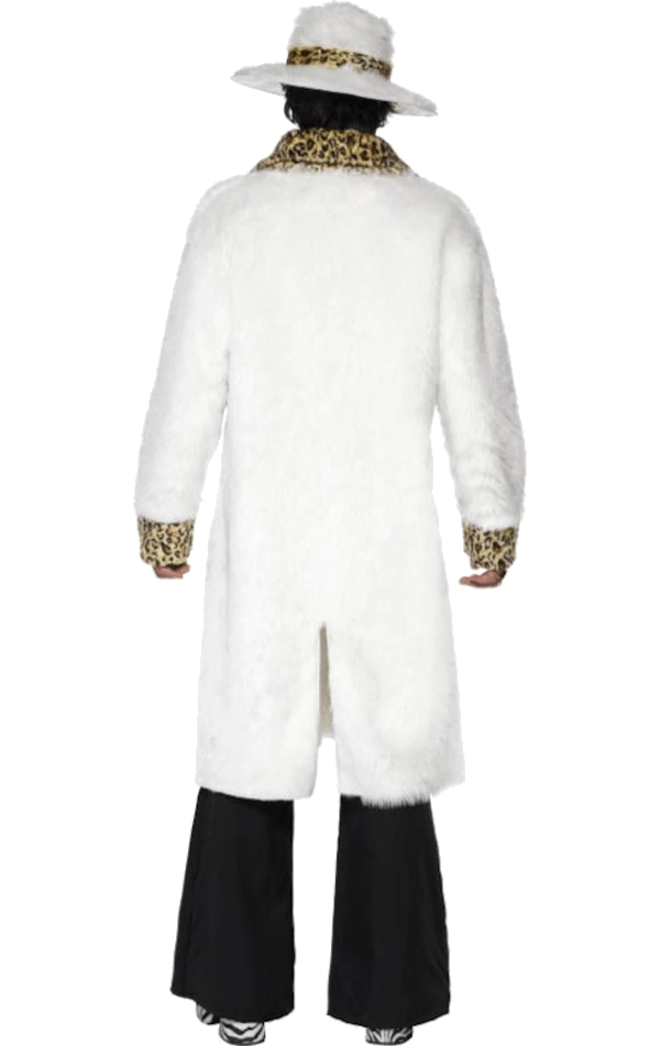 The Adult Faux Fur White Pimp Costume includes a pair of black flared trousers and a long white faux fur coat with a leopard print trim. The impressive pimp outfit is completed with a matching white faux fur hat, with a leopard print band.