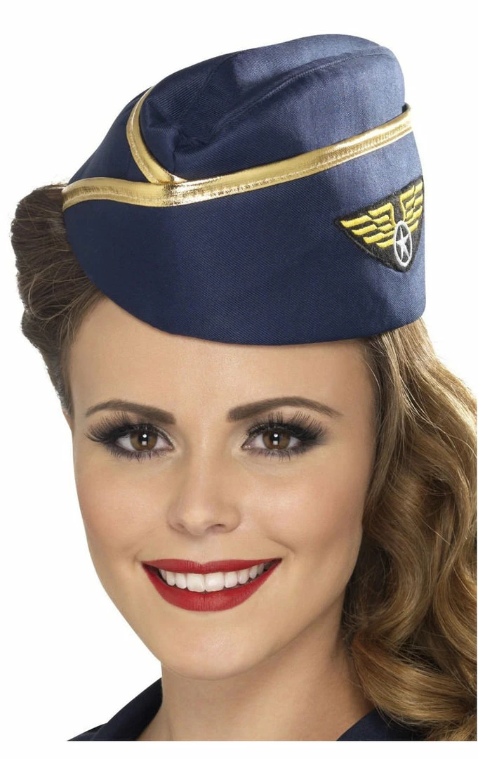 Blue and gold Air Hostess Hat with an airline badge stitched onto the side.