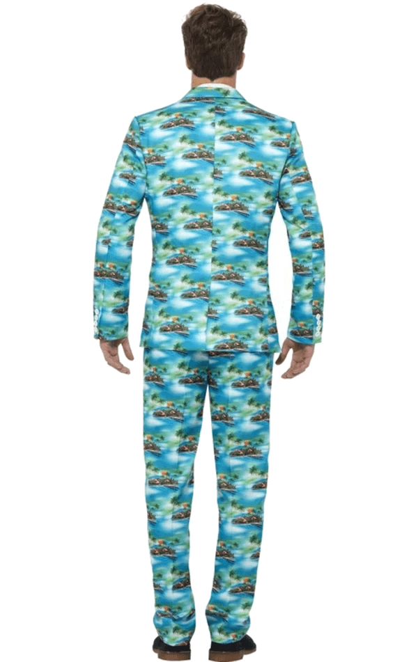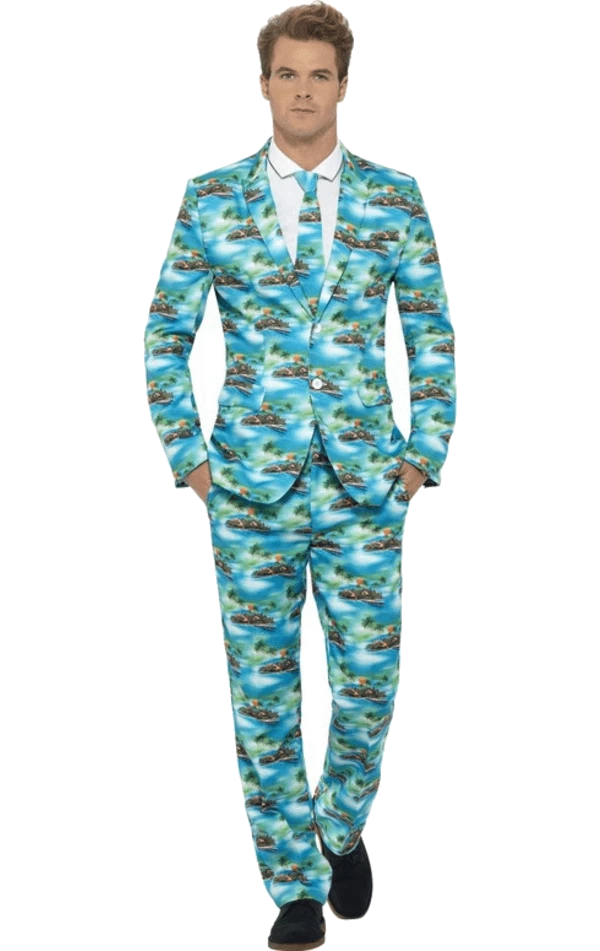 The striking design of the Aloha Patterned Stand Out Suit has a bright blue background with a pattern showing a Pacific paradise on the jacket and trousers.