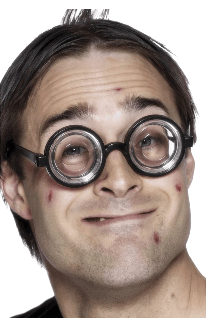 Our Black Geek Glasses have thick black frames with ultra-thick lenses for the eyes to appear unnaturally magnified and bug-eyed.