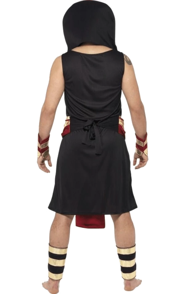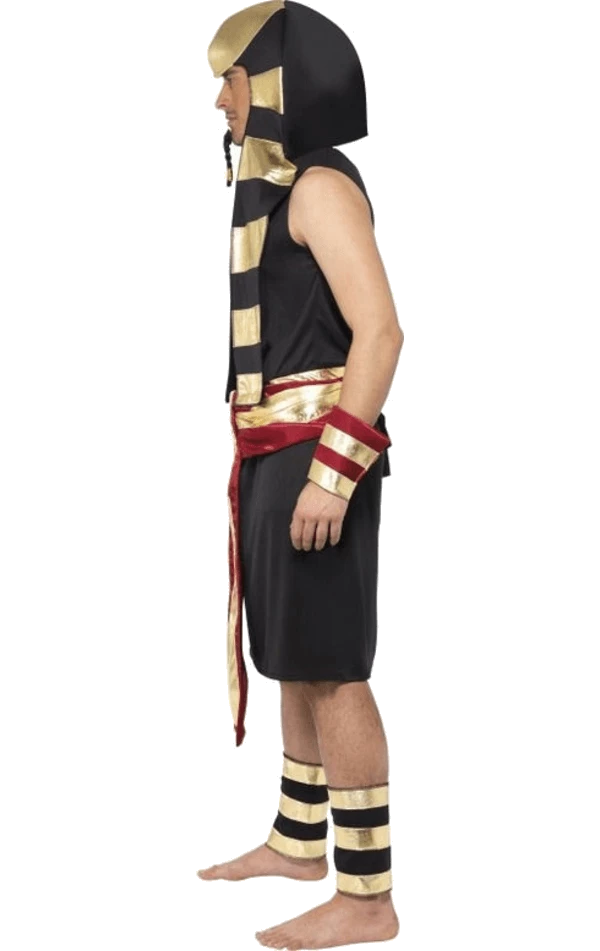 The Adult Egyptian Pharaoh Costume includes a black tunic and a decorative gold and red belt.