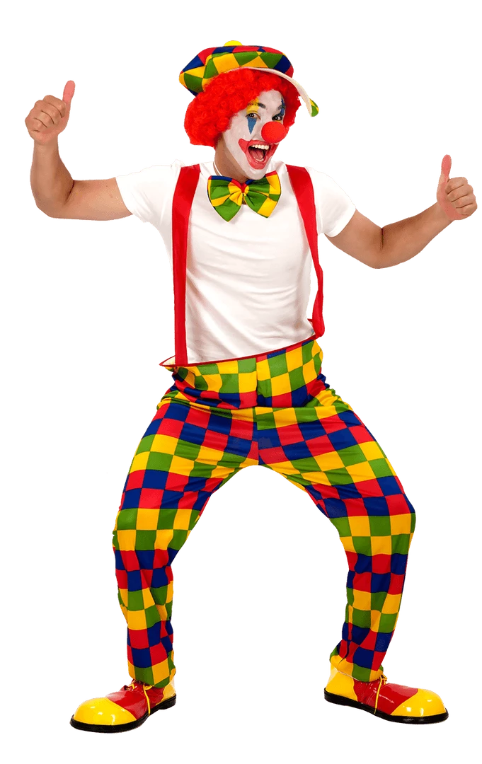 This unisex outfit includes a set of multicoloured chequered hooped trousers with attached braces which are secured to the back of the trousers and fasten in place with two safety pins. The hoop in the trousers is made from a flexible wire which pops back into shape when bent, allowing you to fold away this costume for future use.