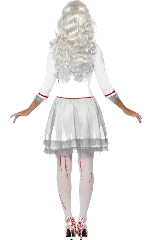 The Blood Drip Bride Halloween Costume includes a grey dress with grey gauze and lace detailing on the skirt.