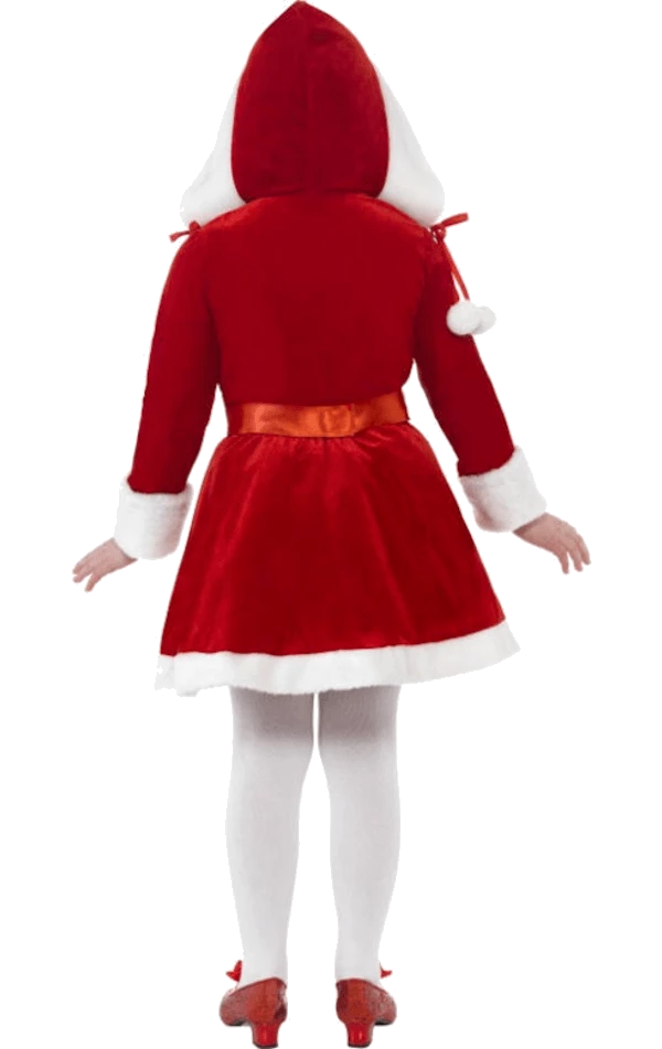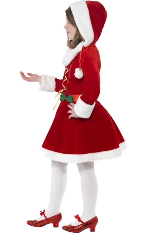 The Child Little Miss Santa Costume includes a red brush velvet effect dress with a white faux fur trim, a gold ribbon lace-up front and holly, pom pom and sequin detailing.