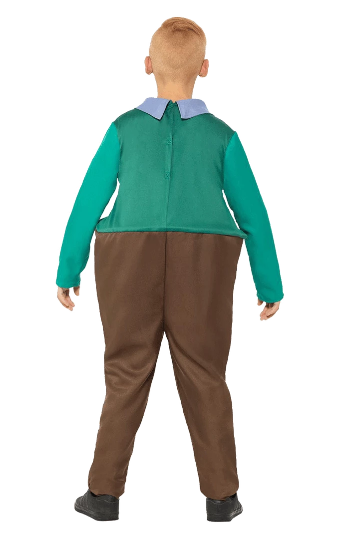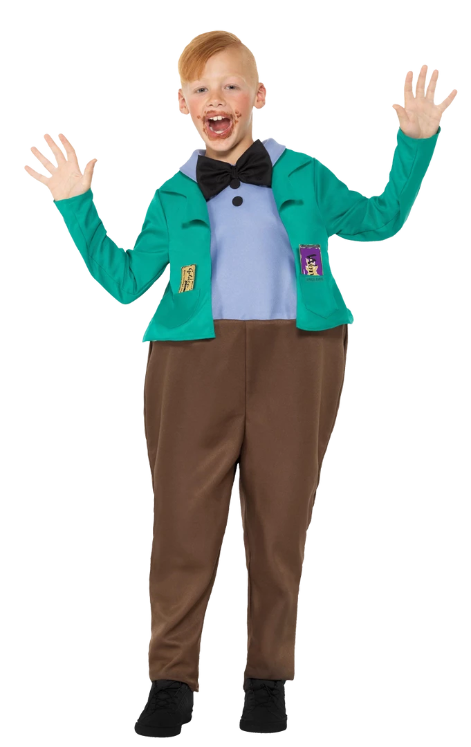 Have your little one explore Willy Wonka’s Chocolate Factory and arrive to school for World Book Day in style with our brilliant Childrens Augustus Gloop Costume! He’s the little boy who can never stop eating sweets and treats, he has a bigger appetite than most humans, but fortunately, he does make for a fantastic fancy dress idea! This complete outfit features a green and blue top with attached bow tie and pockets, a pair of brown trousers, a golden ticket and even a prop chocolate bar prop! If your son is a fan of Roald Dahl’s iconic Charlie & The Chocolate Factory story, they’re sure to love this bright and colourful costume.