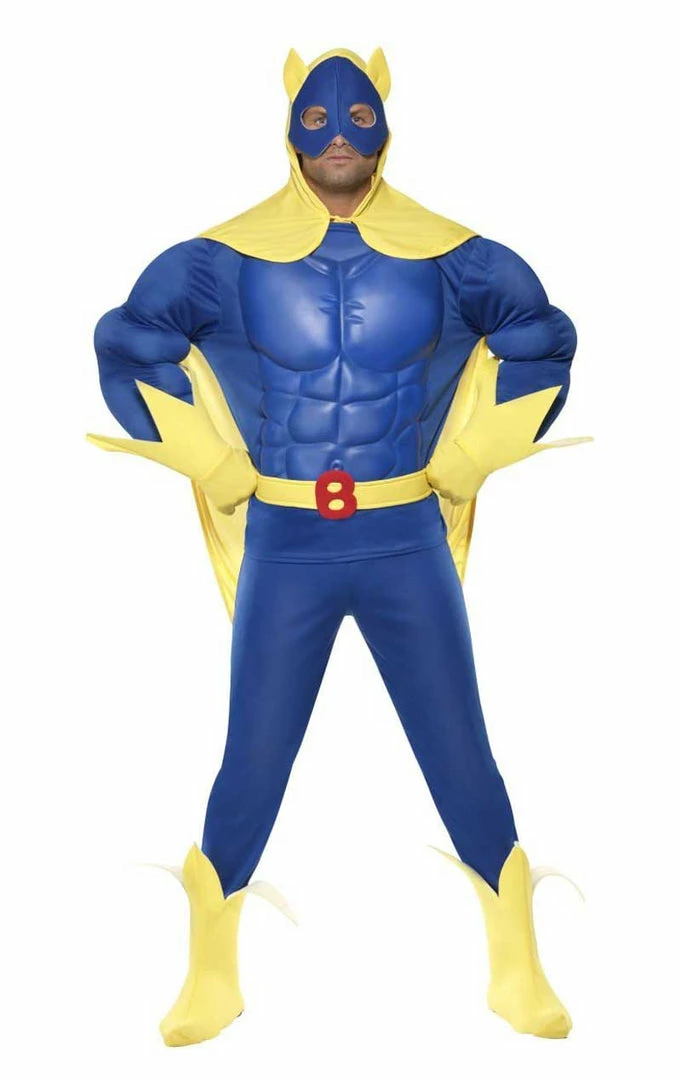 You’ll look fantastic in our Deluxe Bananaman Costume! Eric Twinge turned into a caped superhero on the consumption of a simple banana. Bananaman originally featured as a comic book strip in the early 80’s. A little while later the popular cartoon series was created and he is now one of the most iconic characters remembered by the child of the 80’s. This Official Bananaman costume perfectly captures Eric’s bulging biceps and banana themed superhero outfit.