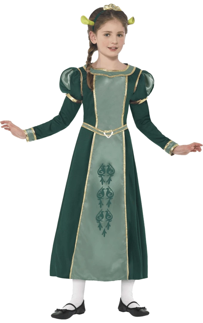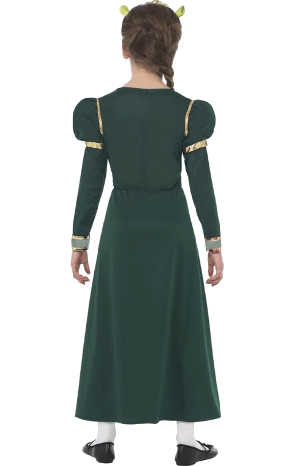 The Shrek Princess Fiona Costume includes a long dark and light green dress with puffed shoulders and printed motif detailing on the front. The dress is trimmed in gold to give it a royal edge.