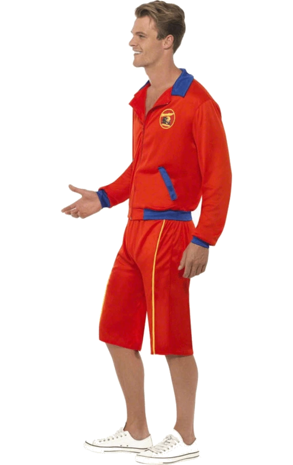 The Men’s Baywatch Costume includes a red zip-up jacket with a blue trim and Baywatch logos on the chest and back.
