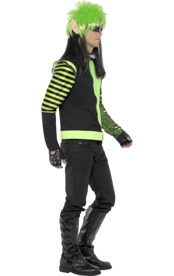 The Men’s Punk Elf Costume includes a black and green jacket with one stripy sleeve and one covered with tattered black mesh.