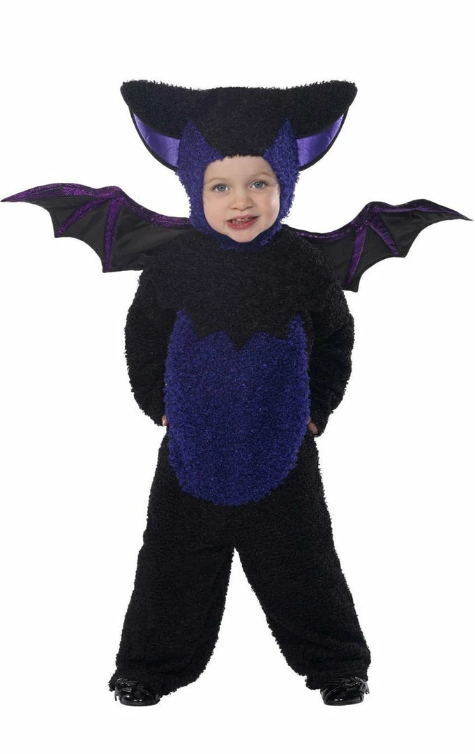 The Toddler Bat Halloween Costume includes a black and purple jumpsuit, a matching hood and an attached pair of black and purple bat wings.